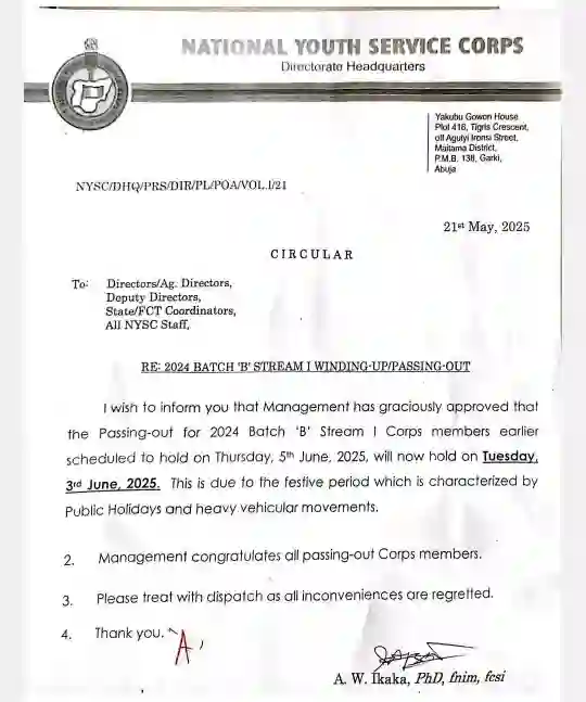 The NYSC Management has announced that the Passing-Out Ceremony for 2024 Batch ‘B’ Stream I Corps members will now hold on Tuesday, June 3rd, 2025, instead of the earlier scheduled Thursday, June 5th.