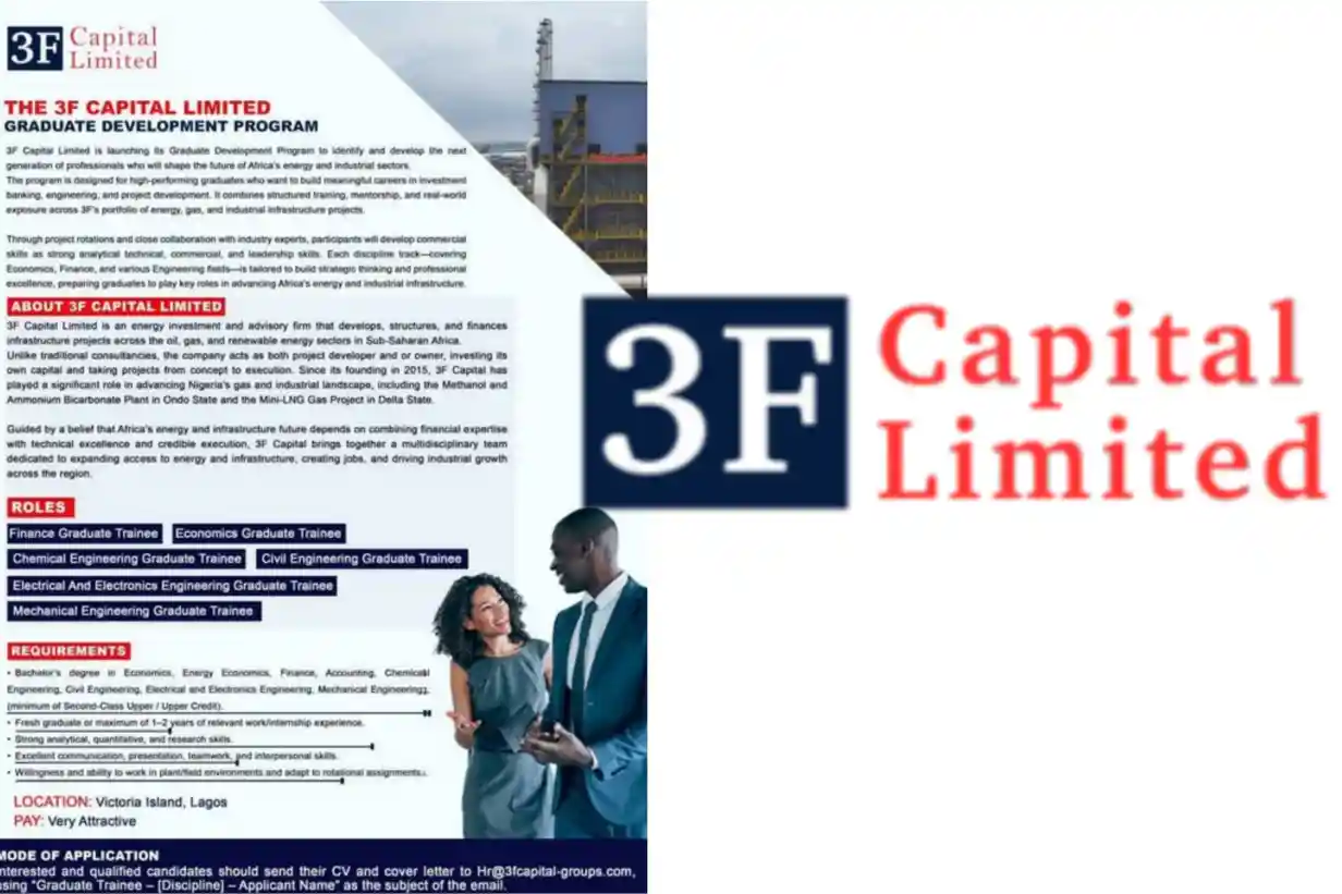 3F Capital Limited has announced the opening of applications for its Graduate Development Program aimed at identifying and training young professionals to shape the future of Africa’s energy and industrial sectors. The trainee program targets high-performing graduates interested in investment banking, engineering, and project development, offering them structured training, mentorship, and hands-on experience across its energy, gas, and industrial infrastructure projects in Nigeria.
