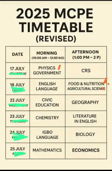 The Examinations Development Center (EDC) has announced a rescheduling of the 2025 Mandatory Central Promotion Examination (MCPE) for all SS2 students in the Abia State school system. Initially scheduled to run from Tuesday, 15 July to Thursday, 24 July, the exam will now hold from Thursday, 17 July to Friday, 25 July, 2025.