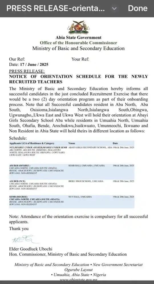 The Abia State Government has announced the official orientation schedule for all newly recruited teachers. This exercise is organized by the Ministry of Basic and Secondary Education and will run for two days, June 19th and 20th, 2025.