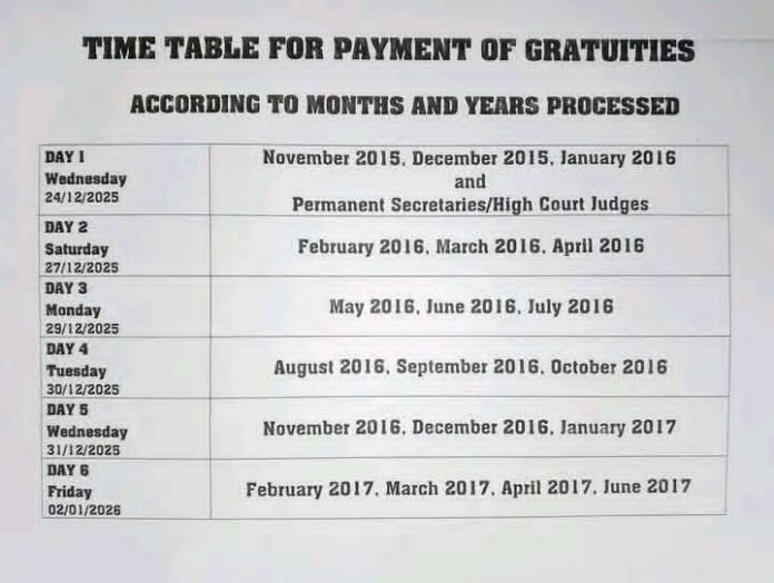 Adamawa State has commenced the payment of gratuity to retirees. The government also stated that death benefits and local government gratuities will follow suit after this phase. Below is the payment timetable, arranged clearly according to day, date, and the months and years covered.