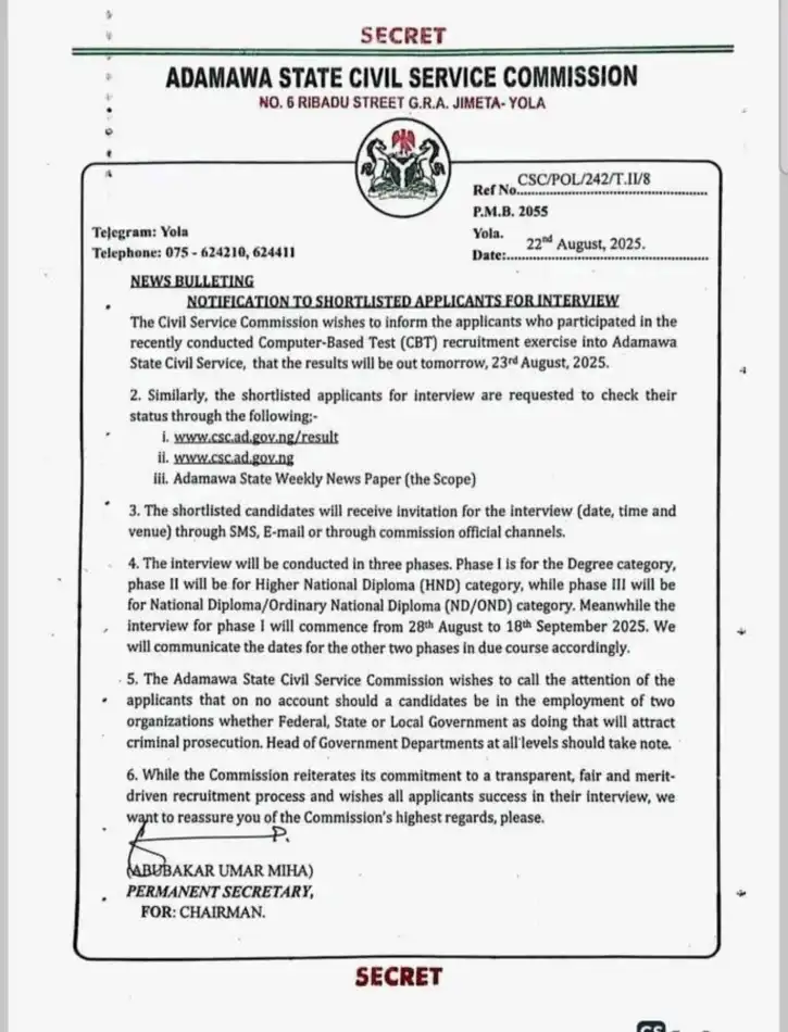 The Adamawa State Civil Service Commission emphasized its commitment to transparency and fairness in the ongoing recruitment. “The Commission reiterates its commitment to a transparent, fair and merit-driven recruitment process and wishes all applicants success in their interview,” the statement read.