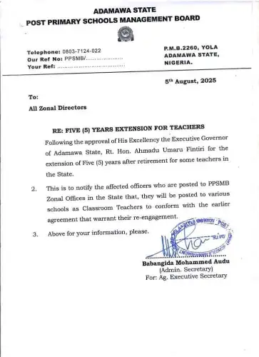 August 5, 2025 – The Adamawa State Post Primary Schools Management Board has announced the extension of five years after retirement for some teachers in the state. In an official memo dated 5 August 2025, the board stated that the approval was granted by the Executive Governor, Rt. Hon. Ahmadu Umaru Fintiri.