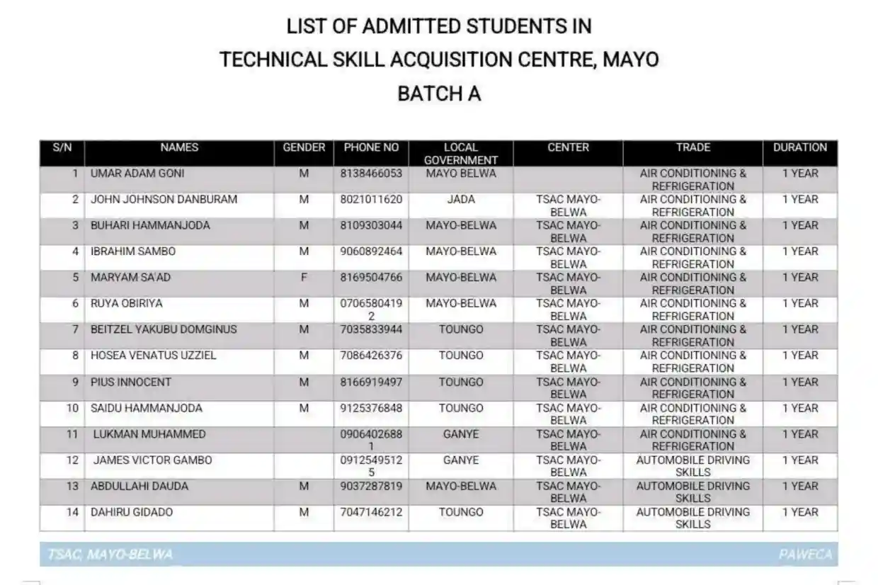 September 24, 2025 – Adamawa State Poverty Alleviation and Wealth Creation Agency (PAWECA) has announced that the admission list into the Technical Skill Acquisition for all the training centers Batch A and Batch B is out. The list of admitted candidates at the Technical Skill Acquisition Centre, Batch A and B, includes names, gender, phone number, local government, centre, trade, and duration.
