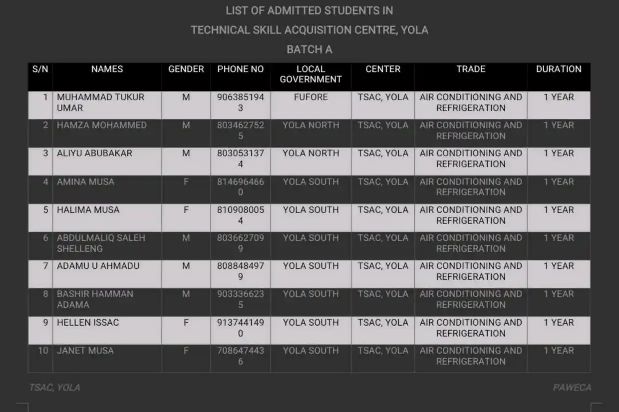 September 23, 2025 – Adamawa State has announced that the admission list into the Technical Skill Acquisition for all the training centers Batch A is out. The list of admitted candidates at the Technical Skill Acquisition Centre, Batch A, includes names, gender, phone number, local government, centre, trade, and duration.