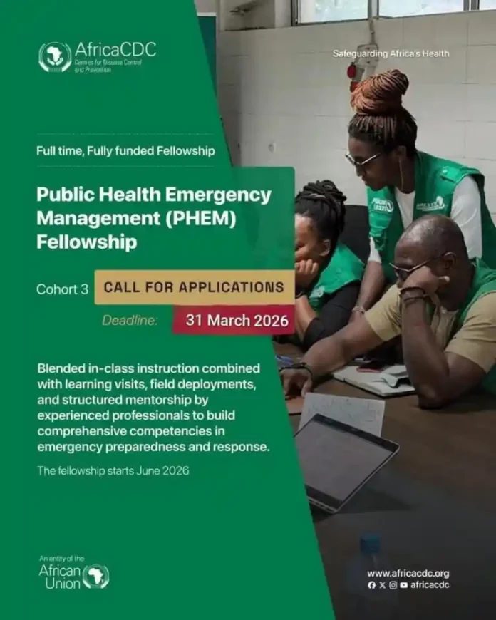 The African Public Health Emergency Management (PHEM) Fellowship Cohort 3 has officially opened applications for qualified public health professionals across Africa. The programme, organised by the Africa Centres for Disease Control and Prevention (Africa CDC), is designed to strengthen the continent’s capacity to prepare for and respond to public health emergencies. The fellowship is set to begin in June 2026.