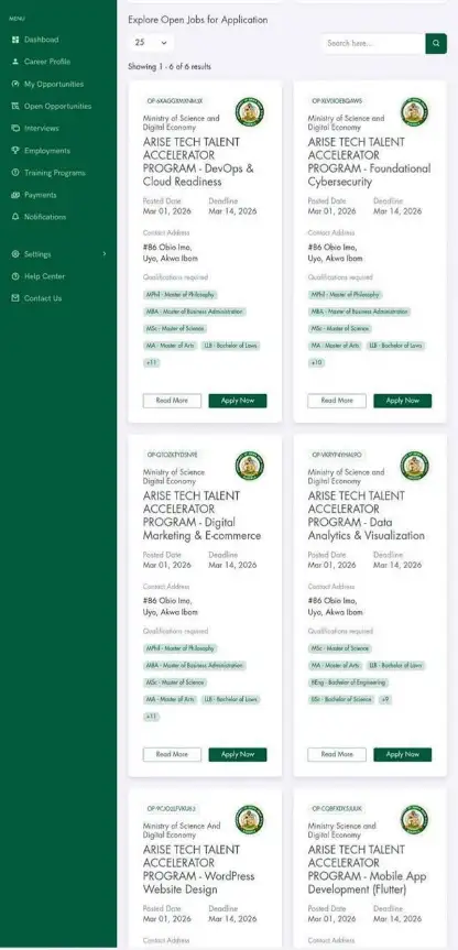 The Akwa Ibom State Government has opened the employment portal for the ARISE Tech Talent Accelerator Program, with six new opportunities now available. The openings were published on the Akwa Ibom State Employment Portal by the Ministry of Science and Digital Economy.