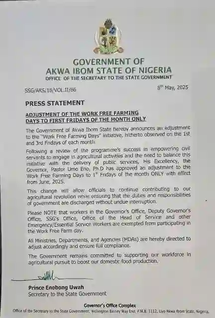 The Government of Akwa Ibom State has made an important update to its Work Free Farming Days policy. Starting from June 2025, civil servants will now observe Work Free Farming Days on the first Friday of each month only, instead of the previous arrangement on the 1st and 3rd Fridays.