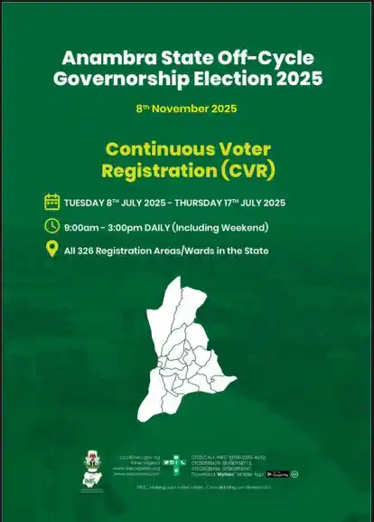 June 26, 2025 – The Independent National Electoral Commission (INEC) has officially announced the Continuous Voter Registration (CVR) exercise for the upcoming Anambra State Off-Cycle Governorship Election scheduled for 8th November 2025.