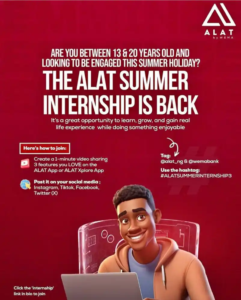 “Summer just got better,” the bank said in its statement. “Are you between 13–20 years old? The ALAT Summer Internship is BACK! Learn, grow, and gain real-life experience — the fun way!”