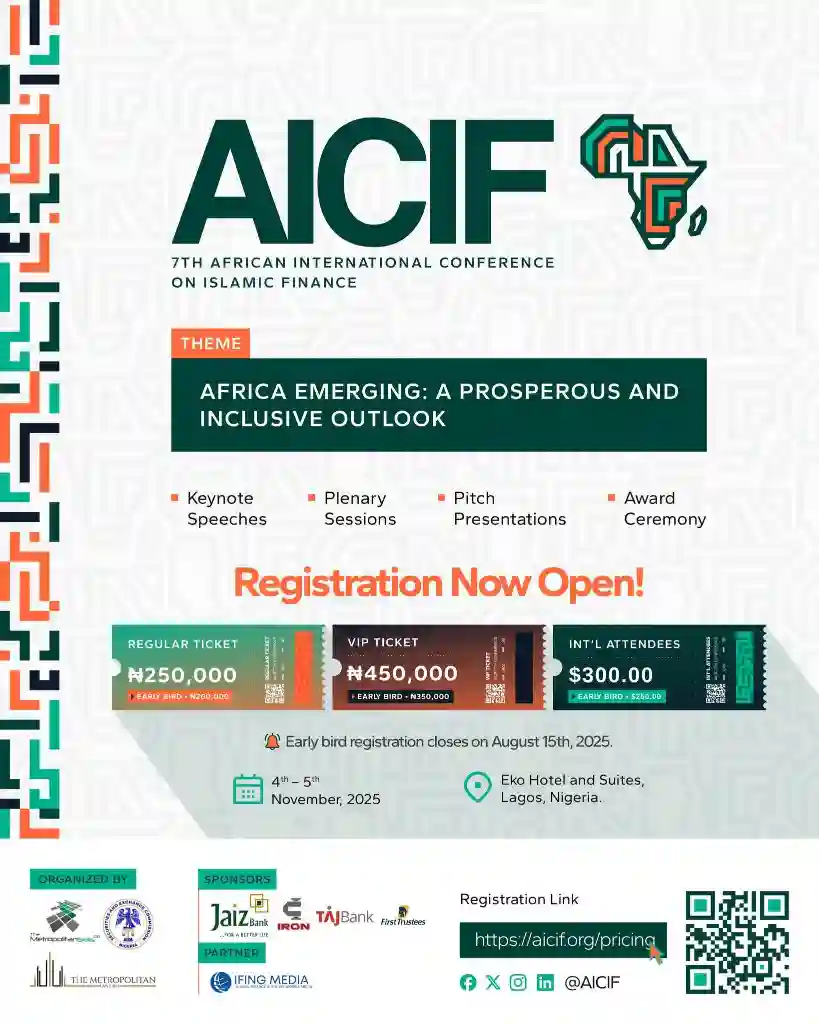 Registration is now open for the 7th African International Conference on Islamic Finance (AICIF 2025), set to take place in Lagos this November. Organizers have described the event as “a defining moment in Africa’s ethical finance journey,” inviting stakeholders to take part in shaping the continent’s financial future.