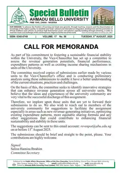 Submissions should be brief and direct, and must be sent to revenpot@abu.edu.ng on or before 15 August 2025. “Your contributions are highly welcome,” the committee noted.