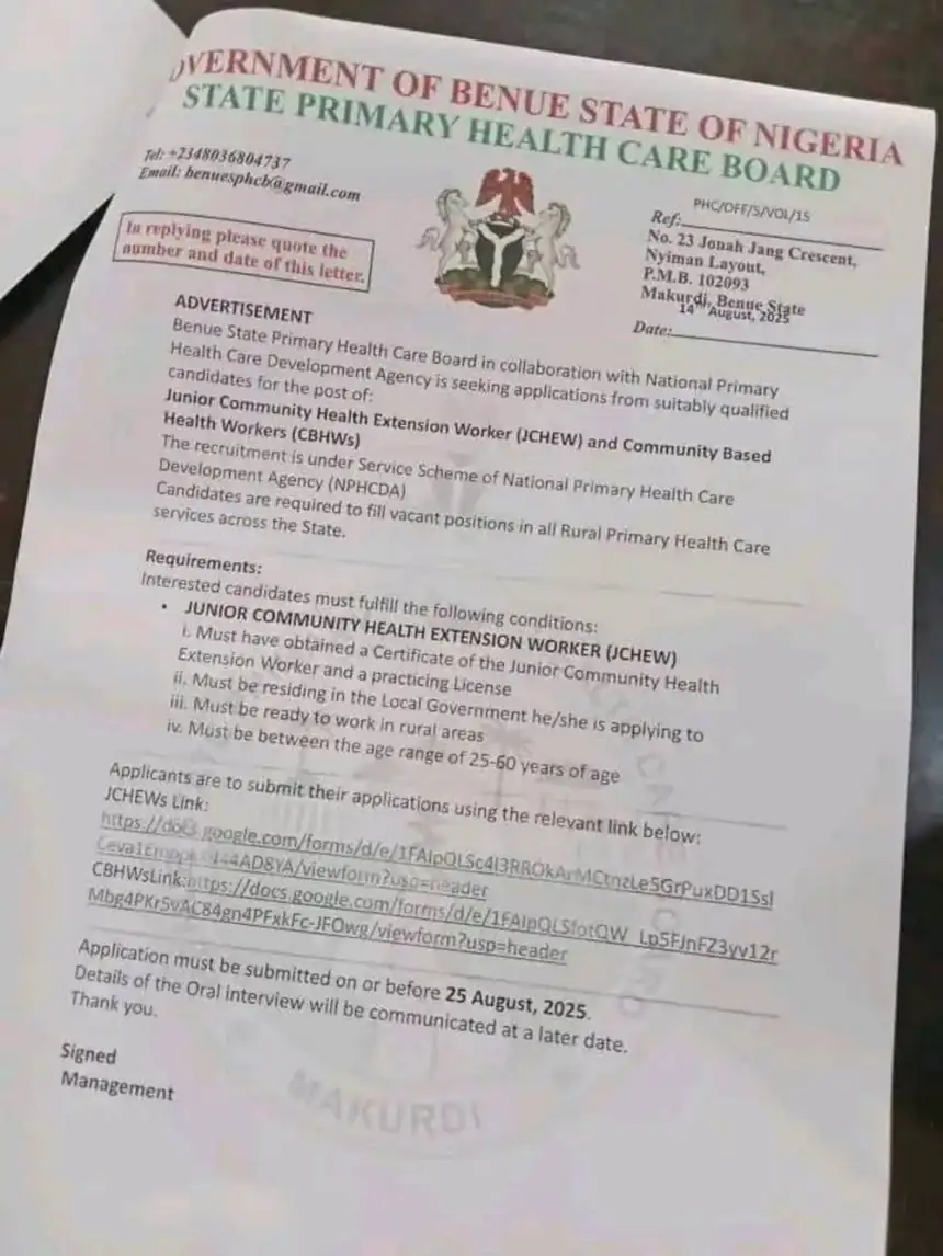 August 15, 2025 – The Benue State Government has announced the recruitment of health workers to strengthen rural healthcare delivery. In partnership with the National Primary Health Care Development Agency (NPHCDA), the Benue State Primary Health Care Board is inviting applications for the positions of Junior Community Health Extension Workers (JCHEWs) and Community Based Health Workers (CBHWs).