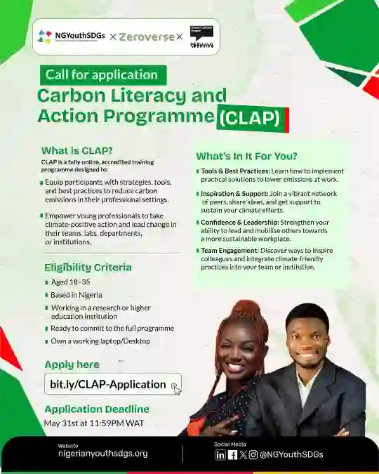 The Carbon Literacy and Action Programme (CLAP) is now open. CLAP is an accredited, fully online training designed for young Nigerians who are passionate about reducing carbon emissions and driving climate action in their schools, workplaces, and communities.