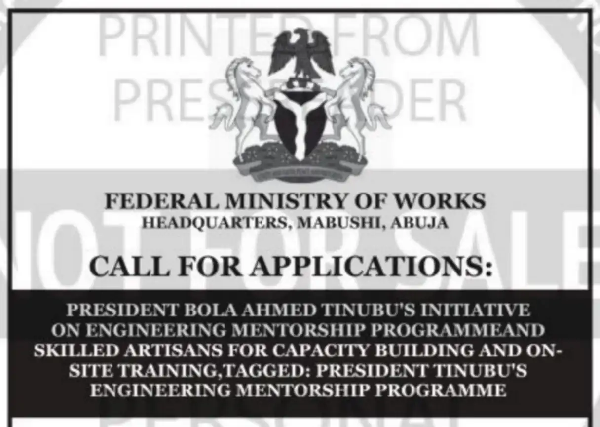 The Federal Ministry of Works has opened applications for President Bola Ahmed Tinubu’s Engineering Mentorship Programme and Skilled Artisans for Capacity Building and On-Site Training, a nationwide initiative targeted at unemployed graduate engineers and skilled artisans across all Local Government Areas in Nigeria.