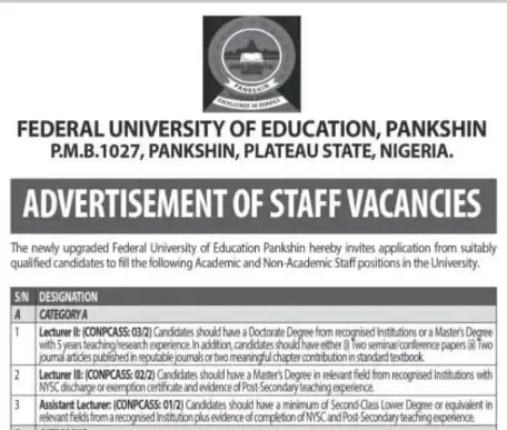 The Federal University of Education, Pankshin in Plateau State, Nigeria, has officially opened its recruitment portal for both academic and non-academic staff positions. This follows its recent upgrade to a full-fledged university. According to a release signed by Mr. James O. Madaki, Ag. Registrar/Secretary to Council, the institution is inviting applications from qualified candidates who meet the stated requirements.
