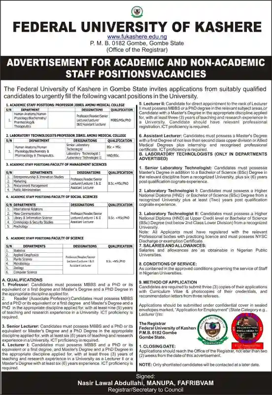 September 11, 2025 – Federal University of Kashere in Gombe State has announced a massive recruitment exercise for both academic and non-academic staff positions.