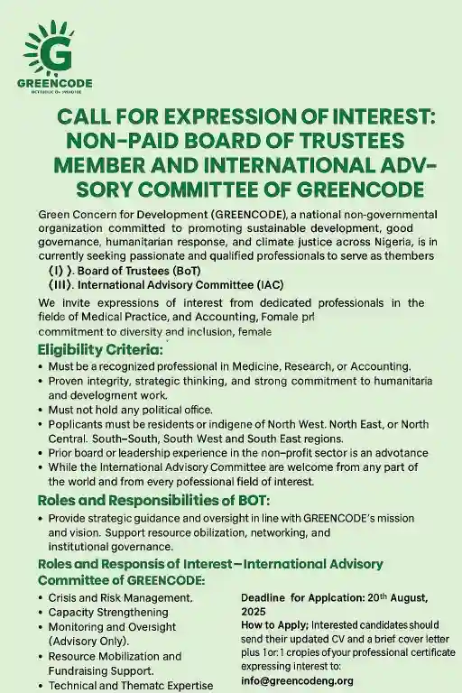 August 10, 2025 – Green Concern for Development (GREENCODE), a national non-governmental organisation focused on sustainable development, good governance, humanitarian response, and climate justice in Nigeria, has announced a call for expressions of interest for two key voluntary roles.