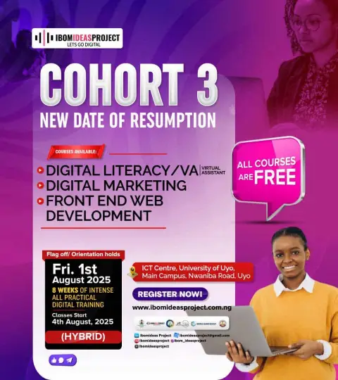 The final opportunity to join the Ibom Ideas Free Digital Training Project is now open, with Cohort 3 scheduled to begin in August 2025.