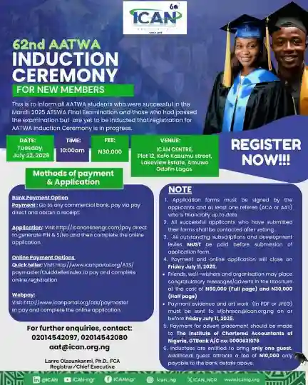 The Institute of Chartered Accountants of Nigeria (ICAN) has officially announced the opening of registration for the 62nd AATWA Induction Ceremony. This event is open to all students who successfully passed the March 2025 ATSWA Final Examination and to previous candidates who are yet to be inducted.