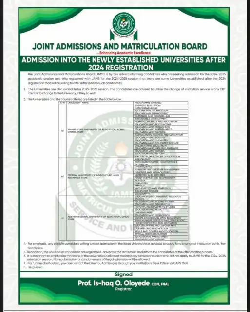 In a public notice signed by the Registrar, Prof. Is-haq O. Oloyede, the board said: “Candidates who are seeking admission for the 2024/2025 academic session and who registered with JAMB for the 2024/2025 session should note that there are some universities established after the 2024 registration that will be willing to offer admission.”
