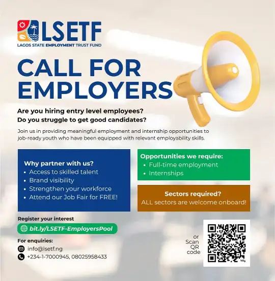 The Lagos State Employment Trust Fund (LSETF) is inviting employers to participate in an upcoming job fair, focused on connecting trained, job-ready youth in Lagos Island Constituency II with meaningful employment and internship opportunities.