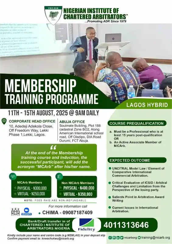 The Nigerian Institute of Chartered Arbitrators (NICArb) has officially opened registration for its Membership Training Programme, designed specifically for professionals with a minimum of 15 years post-qualification experience.