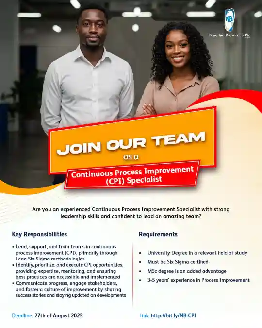 August 14, 2025 – Nigerian Breweries Plc has announced the commencement of its recruitment process for the position of Continuous Process Improvement (CPI) Specialist.