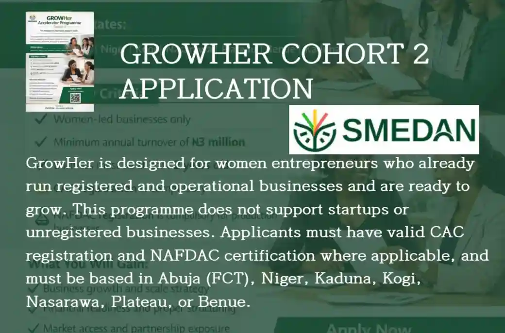 The Small and Medium Enterprises Development Agency of Nigeria (SMEDAN) has opened applications for the GrowHer Accelerator Program Cohort 2. GrowHer is designed for women entrepreneurs who run registered and operational businesses and are ready to scale.