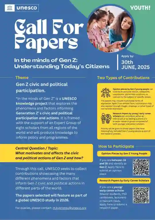 Interested Gen Z youth can submit their opinion pieces by visiting https://bit.ly/43IFCL4, while early career scholars can submit research papers at https://bit.ly/4kYd46x. For inquiries, UNESCO invites participants to reach out via email at m.kypriotou@unesco.org.