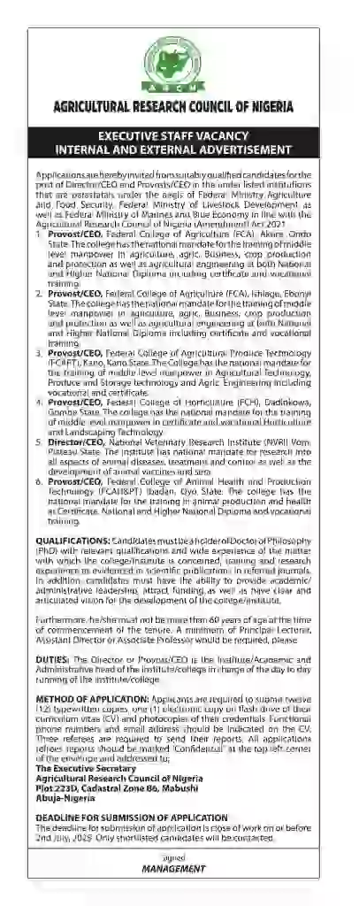 May 21, 2025 – In a move to strengthen leadership in Nigeria’s agricultural sector, the Agricultural Research Council of Nigeria (ARCN) has officially announced internal and external vacancies for top executive positions across six major federal agricultural institutions. The announcement invites applications for the roles of Director/CEO and Provost/CEO, in alignment with the Agricultural Research Council of Nigeria (Amendment) Act 2021.