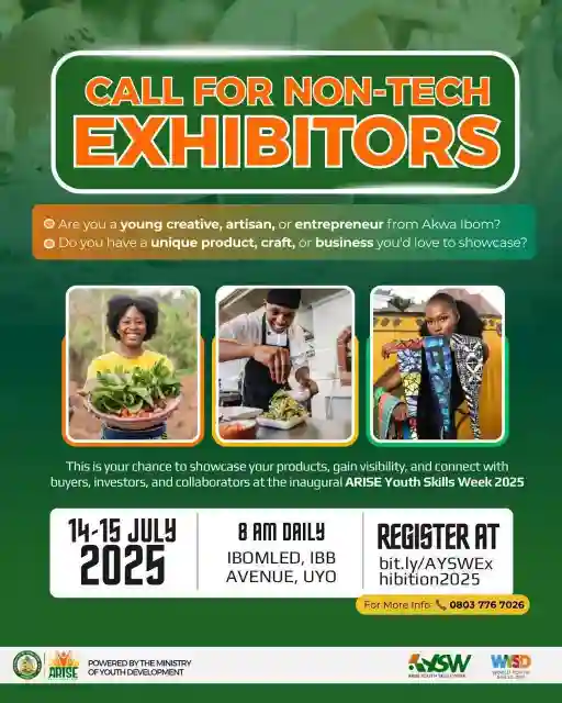 Akwa Ibom State Ministry of Youth Development has officially announced a Call for Exhibitors for the upcoming ARISE Youth Skills Week (AYSW) 2025, scheduled for 14–15 July 2025. The two-day event will take place at IBOMLED, IBB Avenue, Uyo, and begins daily at 8 AM.