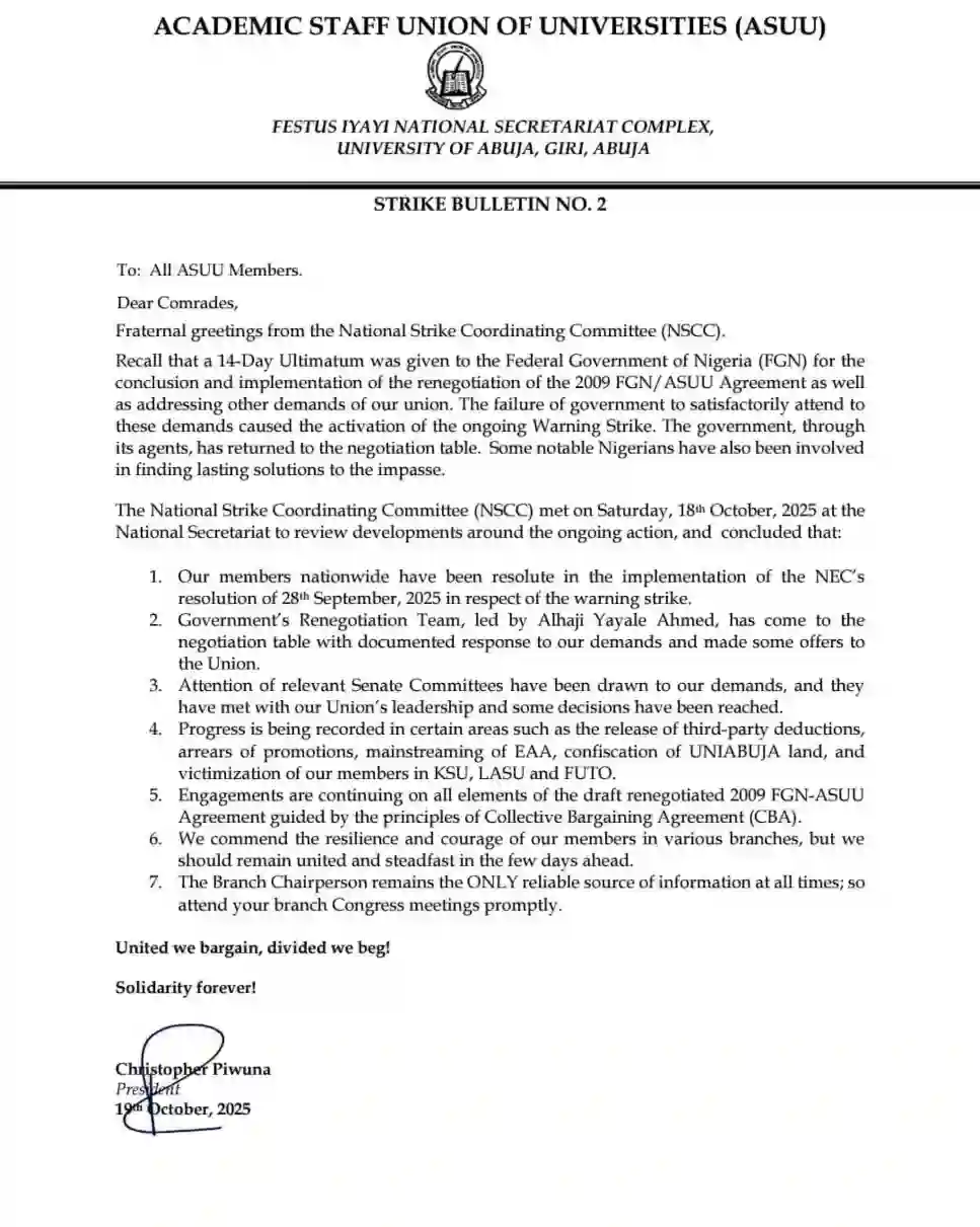 The Academic Staff Union of Universities (ASUU) has released Strike Bulletin No. 2 to update members on the ongoing warning strike and the state of discussions with the Federal Government of Nigeria (FGN).