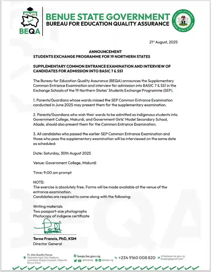 August 21, 2025 – Benue State Government through the Bureau for Education Quality Assurance (BEQA) has announced a supplementary common entrance examination and interview for admission into Basic 7 and SS1 in the 19 Northern States’ Students Exchange Programme (SEP).