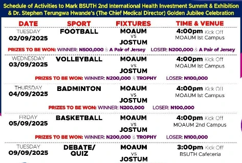 BSUTH Chief Medical Director, Dr. Terungwa Stephen Hwande, has announced a sports competition for students of MOAUM and JOSTUM. The event will run from September 2nd to 29th, 2025, and is part of activities leading up to the Second International Health Investment Summit and Exhibition. It also marks celebrations for his Golden Jubilee.