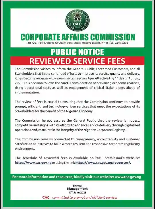 The Commission further assured that transparency and customer satisfaction remain central to its mission. The full schedule of the new service fees is available at https://www.cac.gov.ng/resources/.