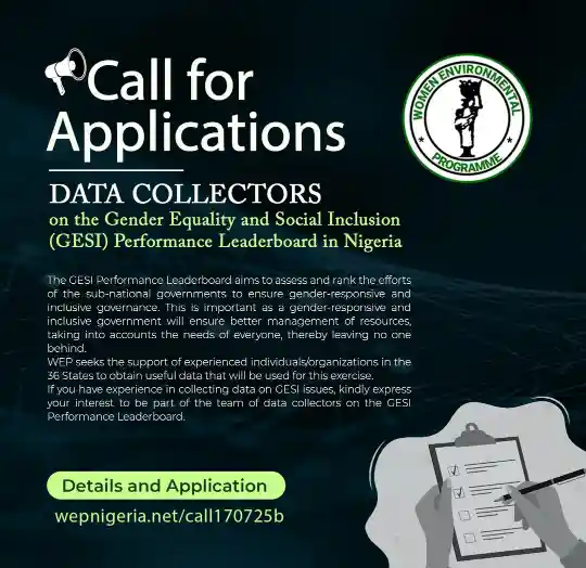 The Women Environmental Programme (WEP) is inviting experienced individuals and organizations from all 36 states of Nigeria to apply as data collectors for the Gender Equality and Social Inclusion (GESI) Performance Leaderboard.