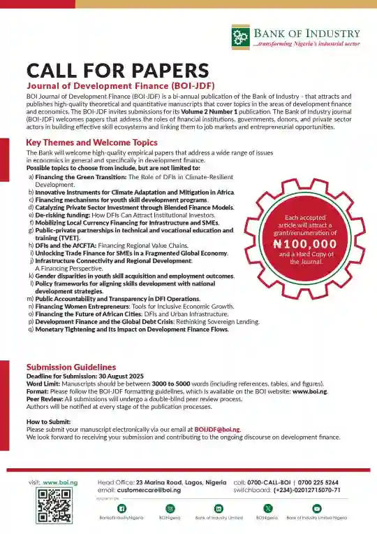 The Bank of Industry (BOI) has announced a call for papers for its prestigious Journal of Development Finance (BOI-JDF). Scholars, researchers, and industry professionals are invited to submit high-quality manuscripts for Volume 2, Number 1 of the bi-annual publication, which focuses on critical issues in development finance and economics. Each accepted article will receive a grant of N100,000 and a hard copy of the journal.