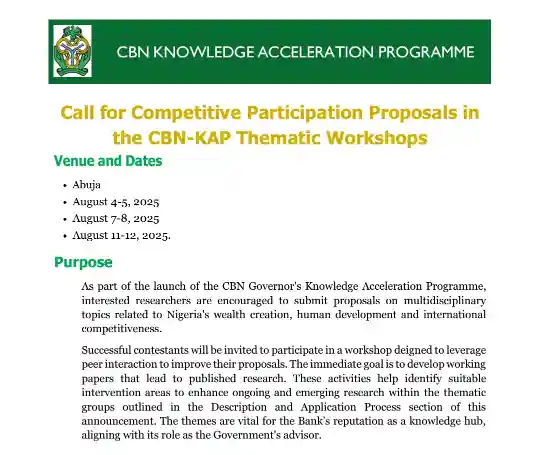 The Central Bank of Nigeria (CBN) has officially announced a call for competitive participation proposals under its Knowledge Acceleration Programme (KAP), and is inviting researchers to contribute to national development through thematic workshops scheduled in Abuja.