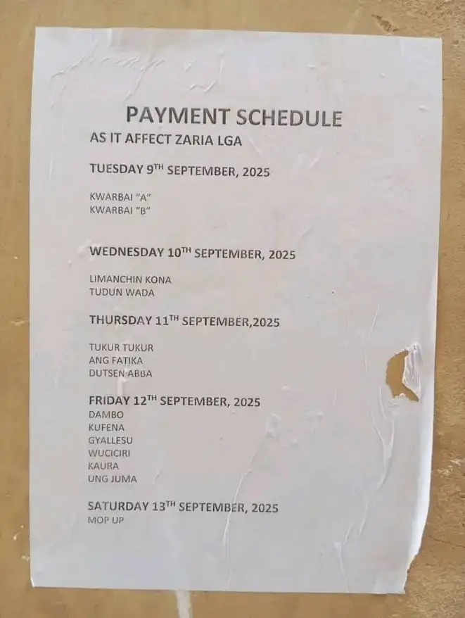 The Zaria Local Government Area of Kaduna State has announced the payment schedule for the Conditional Cash Transfer (CCT) and Rapid Response Register (RRR) program. According to officials, the exercise will begin on Tuesday, September 9, 2025. “Beneficiaries are advised to come out on their scheduled dates to ensure smooth payment,” a representative said.