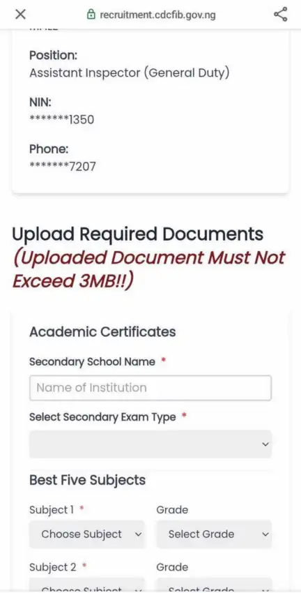 To print, visit the portal link https://recruitment.cdcfib.gov.ng, enter your National Identity Number (NIN) and Phone Number and click on Retrieve Examination Slip. Make sure to update your profile and upload required documents via the portal.