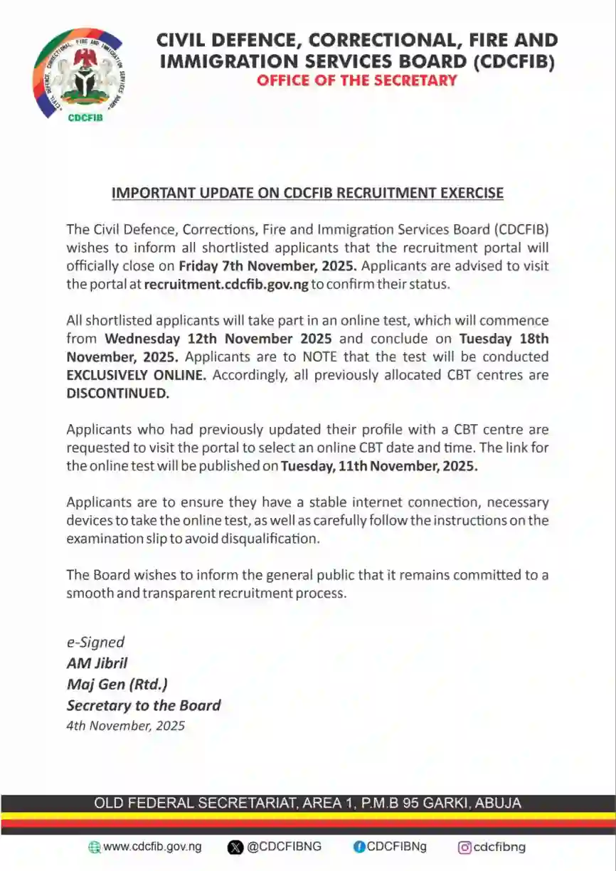The Civil Defence, Correctional, Fire and Immigration Services Board (CDCFIB) has issued an important update concerning its ongoing recruitment exercise. According to a statement signed by the Secretary to the Board, Maj. Gen. (Rtd.) A.M. Jibril, the recruitment portal will officially close on Friday, November 7, 2025.