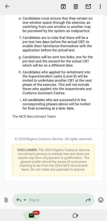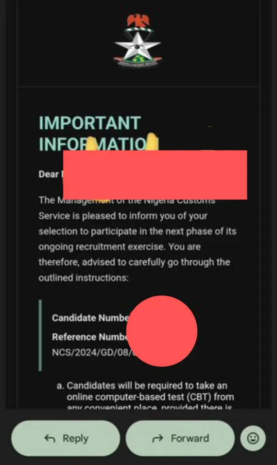 “Dear [candidate], The Management of the Nigeria Customs Service is pleased to inform you of your selection to participate in the next phase of its ongoing recruitment exercise. You are therefore, advised to carefully go through the outlined instructions: