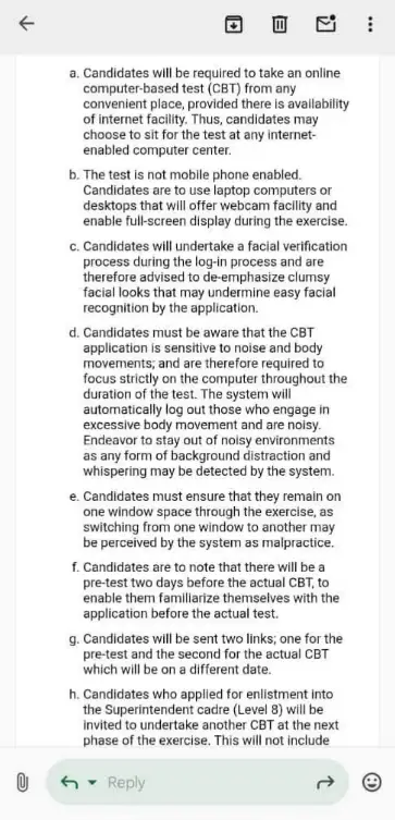 h. Candidates who applied for enlistment into the Superintendent cadre (Level 8) will be invited to undertake another CBT at the next phase of the exercise. This will not include those who applied into the Inspectorate and Customs Assistant Cadres.