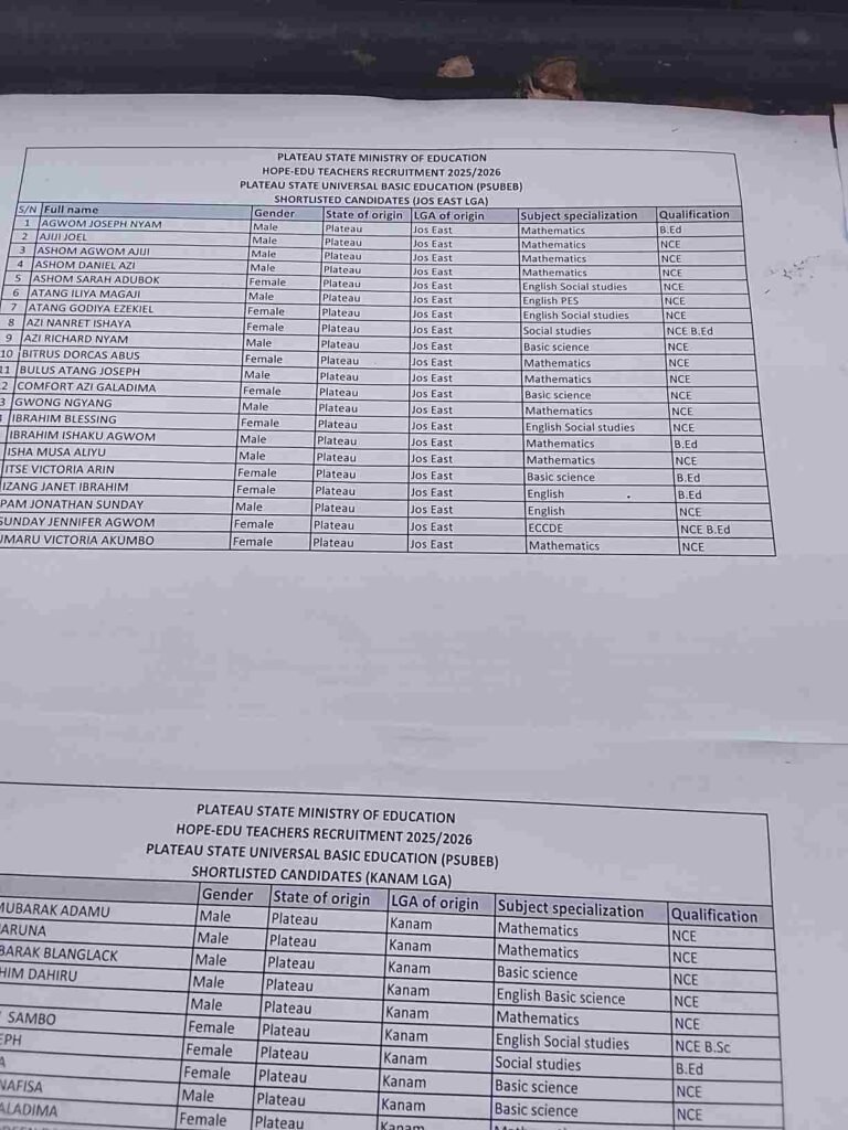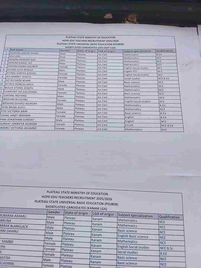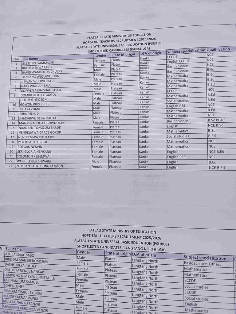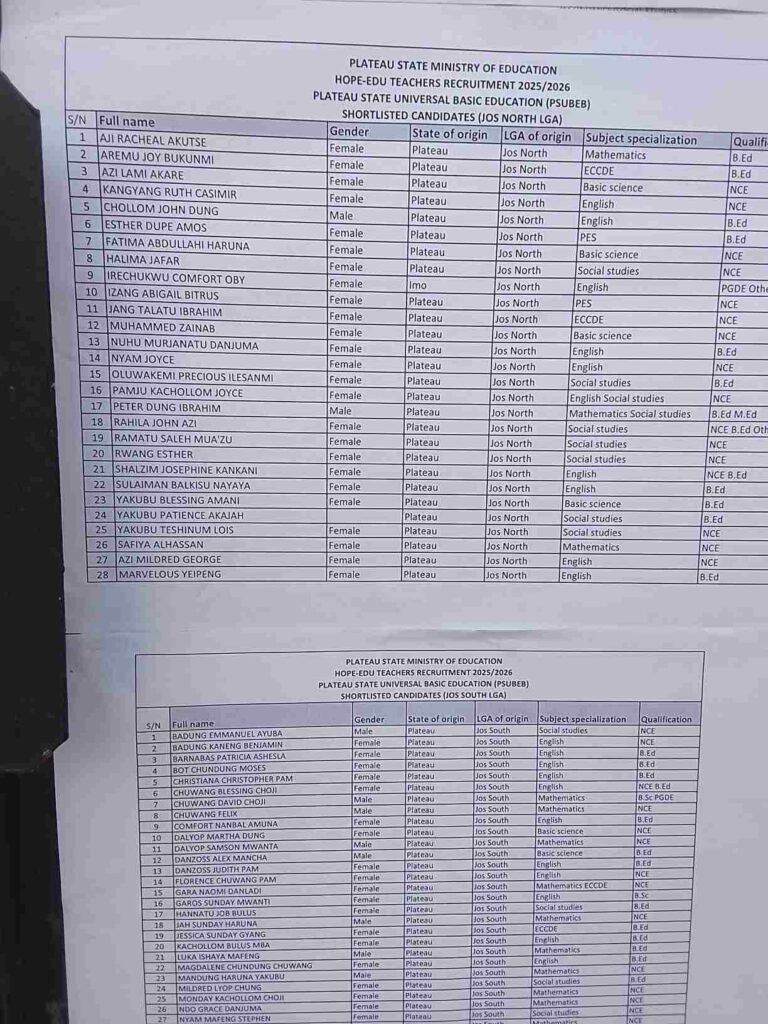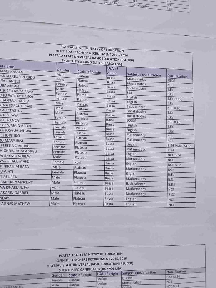 The Plateau State Ministry of Education has released the names of shortlisted candidates for the HOPE-EDU Teachers Recruitment 2025/2026. Candidates from all 17 LGAs — Barkin Ladi, Bassa, Bokkos, Jos East, Jos North, Jos South, Kanam, Kanke, Langtang North, Langtang South, Mangu, Mikang, Pankshin, Qua’an Pan, Riyom, Shendam, and Wase — can check their names.