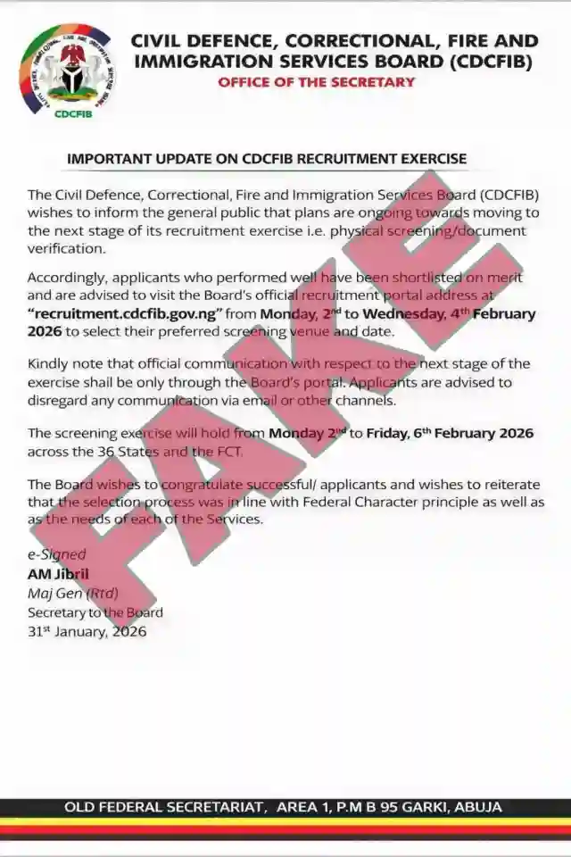 It further claims that “applicants who performed well have been shortlisted on merit and are advised to visit the Board’s official recruitment portal address at recruitment.cdcfib.gov.ng from Monday, 2nd to Wednesday, 4th February 2026 to select their preferred screening venue and date.”