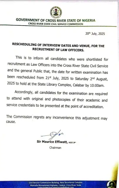 In an official statement, the Commission said, “The date for written examination has been rescheduled from 21st July, 2025 to Saturday 2nd August, 2025 to hold at the University of Cross River State (UNICROSS) Calabar by 10:00am.”