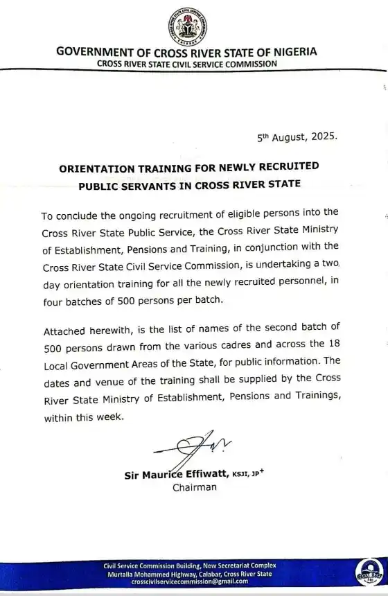 In a statement dated 5 August 2025, the Cross River State Ministry of Establishment, Pensions and Training, in collaboration with the Civil Service Commission, revealed that the training will run for two days and will be conducted in four batches of 500 participants each.