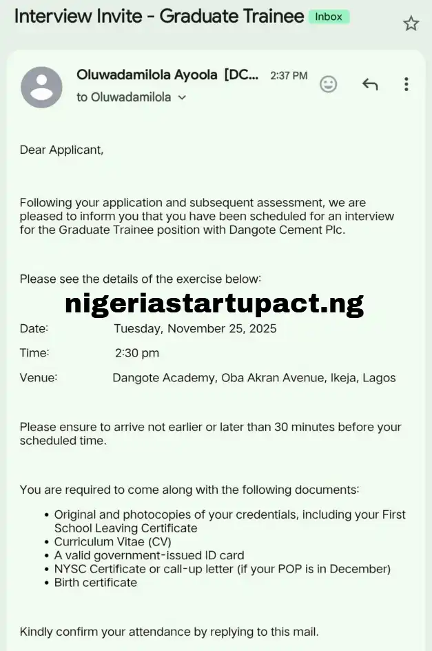 Dangote Cement Plc has sent out an interview invite to applicants shortlisted for its Graduate Trainee position. In the email message titled Interview Invite – Graduate Trainee, the company stated, “Following your application and subsequent assessment, we are pleased to inform you that you have been scheduled for an interview for the Graduate Trainee position with Dangote Cement Plc.”