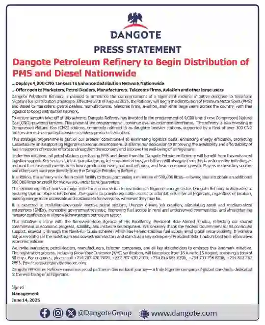 “We are launching a strategic programme aimed at improving fuel availability and lowering distribution costs for critical sectors,” the company said in the statement. “The Dangote Refinery is also offering a credit facility to qualifying buyers to help ease the burden of fuel costs.”